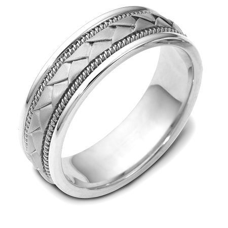 18 kt white gold hand made comfort fit Wedding Band 7.0 mm wide. The center of the band has a handcrafted braid with a handmade rope on each side of the braid. The center of the ring has a brush finish and the edges are polished. Different finishes may be selected or specified.