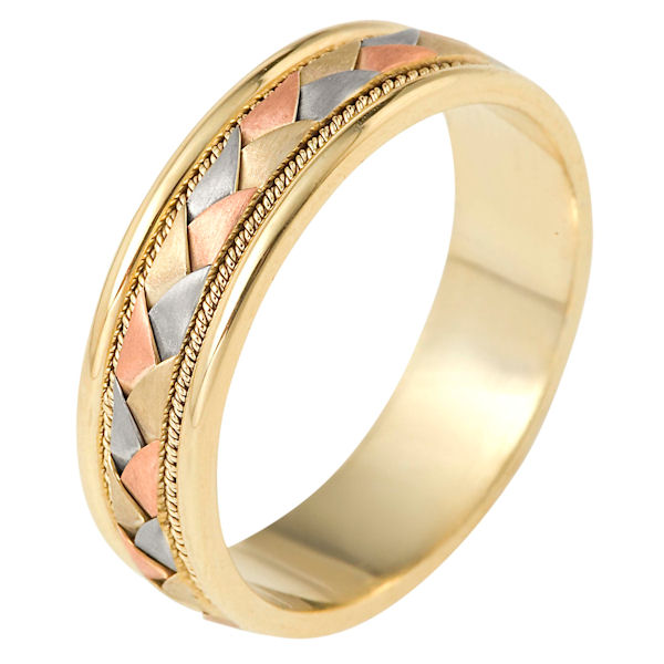 18 kt tri-color hand made comfort fit Wedding Band 7.0 mm wide. The center of the band has a handcrafted braid with a handmade rope on each side of the braid. The center of the ring has a brush finish and the edges are polished. Different finishes may be selected or specified.