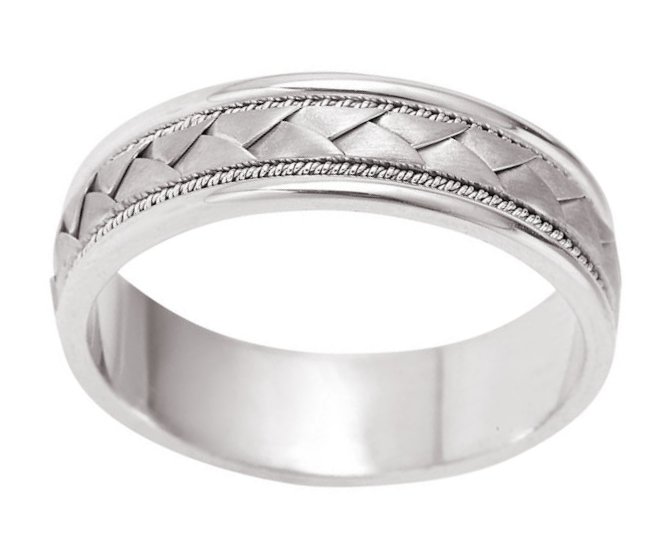 18kt, white gold, hand made, braided, comfort fit Wedding Band 7.0 mm wide. The center of the band has a handcrafted braid with a handmade rope on each side of the braid. The center of the ring has a brush finish and the edges are polished. Different finishes may be selected or specified.