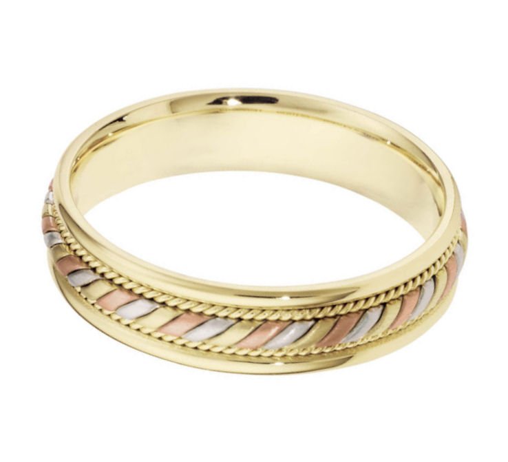 18 kt tri-color hand made comfort fit, 5.0 mm wide wedding band. The center has a beautiful handmade rope design and smaller ropes on each side. The center portion has a brush finish and the edges are polished. Different finishes may be selected or specified.