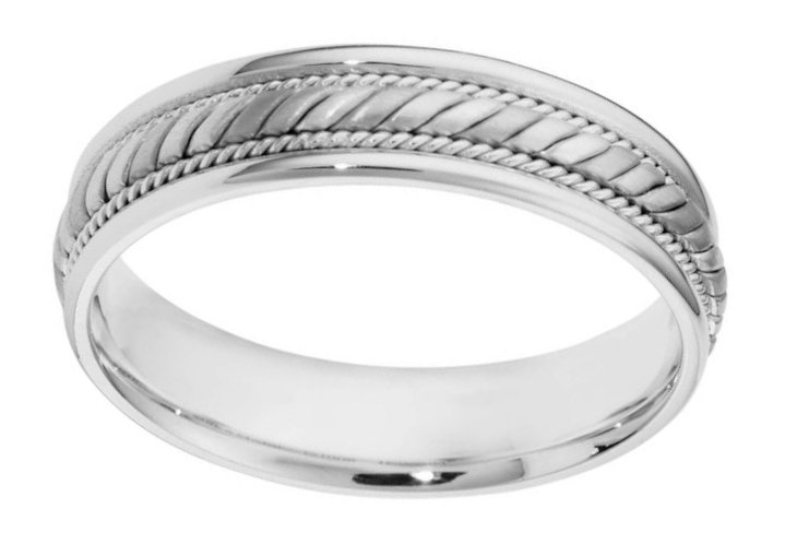 Platinum hand made, comfort fit, 5.0 mm wide wedding band. The center has a beautiful handmade rope design and smaller ropes on each side. The center portion has a brush finish and the edges are polished. Different finishes may be selected or specified.