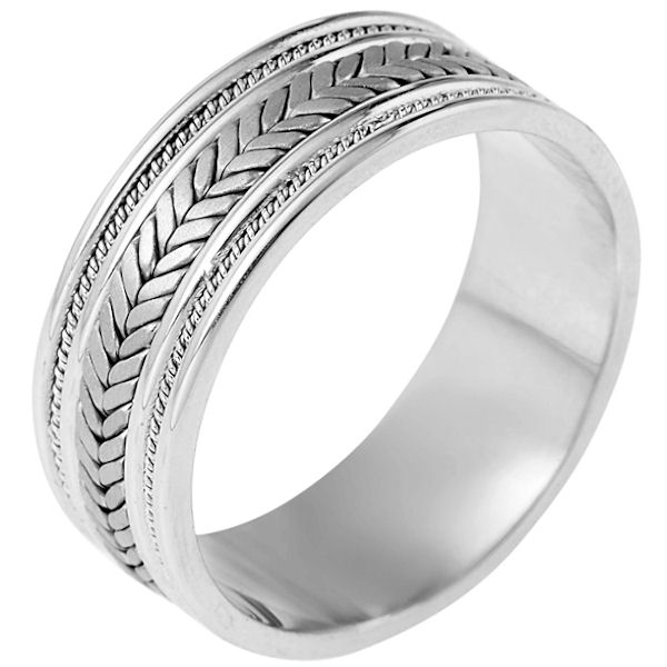 Platinum hand made comfort fit Wedding Band 9.0 mm wide. The ring has a combination of beauitful handmade braids and ropes. The center has matte finish and the edges are polished. Different finishes may be selected or specified.