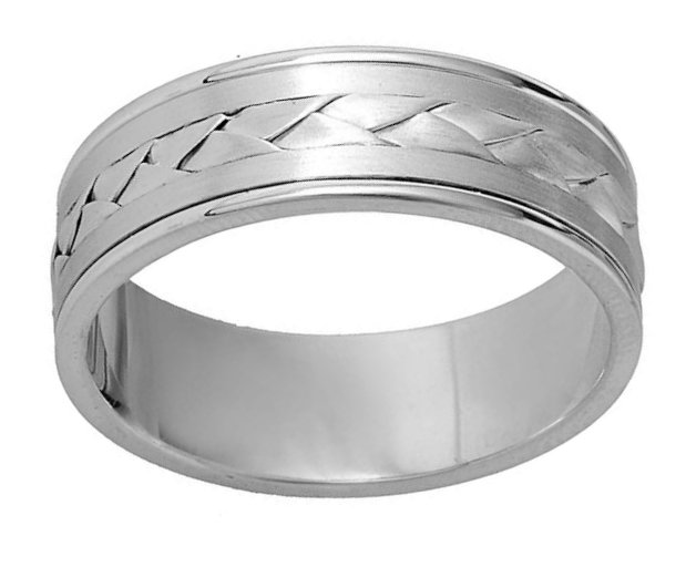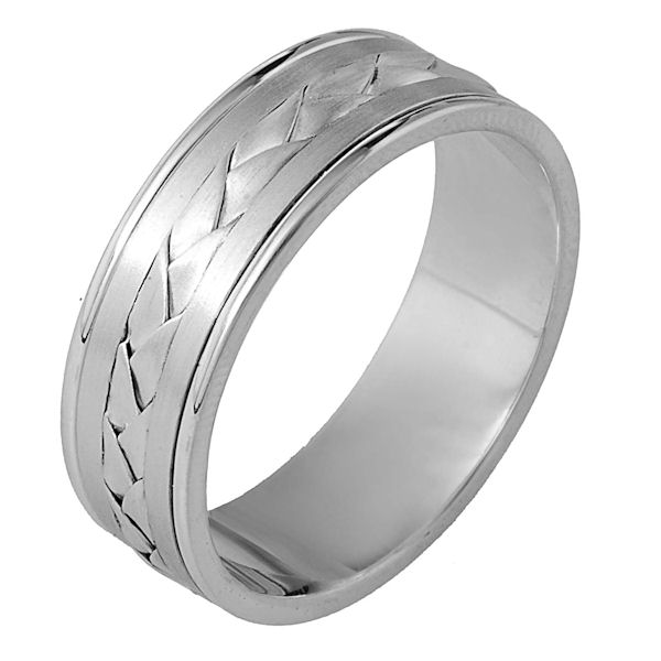 Platinum hand made comfort fit Wedding Band 7.0 mm wide. The ring has a hand made braid in the center that has a brush finish. The separate pieces next to the braid are matte finish and the edges are polished. Different finishes may be selected or specified.