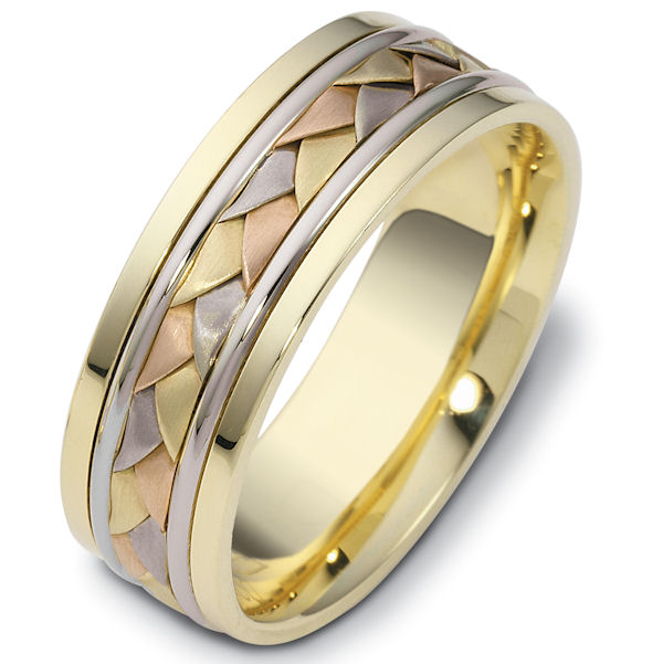 18 kt hand made comfort fit Wedding Band 7.0 mm wide. The ring has a hand made braid in the center that has a brush finish. The rest of the band has a polished finish. Different finishes may be selected or specified.