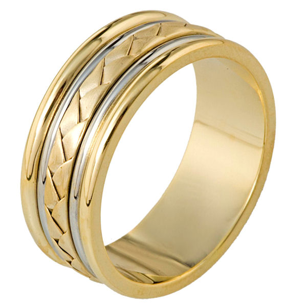 14 kt hand made comfort fit Wedding Band 8.5 mm wide. The ring has a hand made braid in the center that has a matte finish. The rest of the ring has a polished finish. Different finishes may be selected or specified.