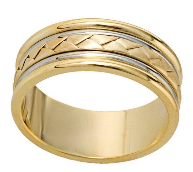 18 kt hand made comfort fit Wedding Band 8.5 mm wide. The ring has a hand made braid in the center that has a matte finish. The rest of the ring has a polished finish. Different finishes may be selected or specified.