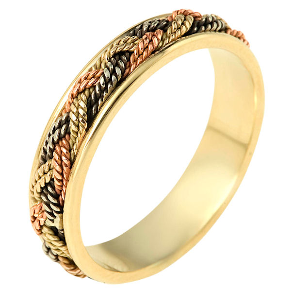 14 kt tri-color hand made comfort fit Wedding Band 5.0 mm wide. The ring has a beautiful hand made braid in the center. The whole ring has a polished finish. Different finishes may be selected or specified.