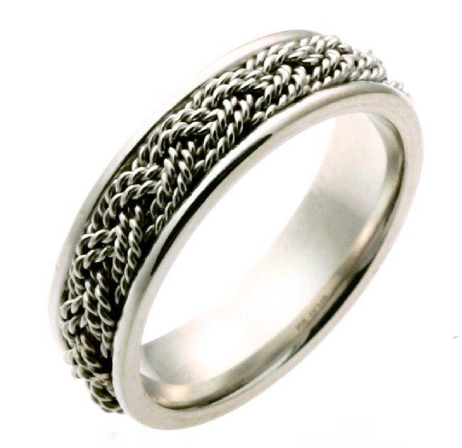 Platinum hand made comfort fit Wedding Band 5.0 mm wide. The ring has a beautiful hand made braid in the center. The whole ring has a polished finish. Different finishes may be selected or specified.