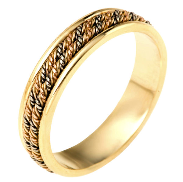 14 kt Tri-color braid hand made comfort fit Wedding Band 5.0 mm wide. The ring has two ropes intricately hand made braids in the center. The ring has a polished finish. Different finishes may be selected or specified.