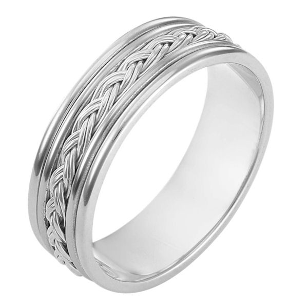 18 kt white gold, hand made comfort fit Wedding Band 7.0 mm wide. The ring has a hand made polished braid in the center. The whole ring has a polish finish. Different finishes may be selected or specified.