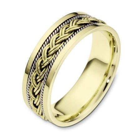 18 kt two-tone hand made comfort fit Wedding Band 7.0 mm wide. There is a hand made braid in the center of the band and one hand crafted rope on each side of the braid. The whole ring has a polished finish. Different finishes may be selected or specified.