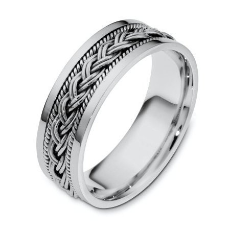 18 kt white gold, hand made comfort fit Wedding BandPlatinum wide. There is a hand made braid in the center of the band and one hand crafted rope on each side of the braid. The whole ring has a polished finish. Different finishes may be selected or specified.
