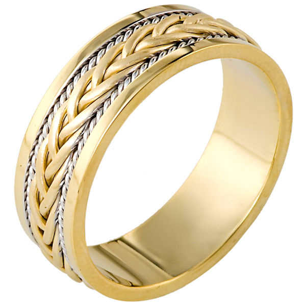 14 kt two-tone hand made comfort fit Wedding Band 7.0 mm wide. There is a hand made braid in the center with one rope on each side of the braid. The center braid has a brush finish and the rest of the ring has a polished finish. Different finishes may be selected or specified.