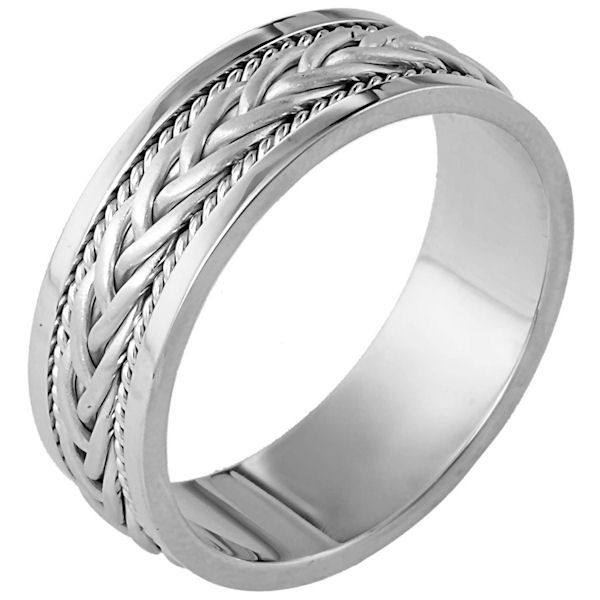 18 kt white gold, hand made comfort fit Wedding Band 7.0 mm wide. There is a hand made braid in the center with one rope on each side of the braid. The center braid has a brush finish and the rest of the ring has a polished finish. Different finishes may be selected or specified.