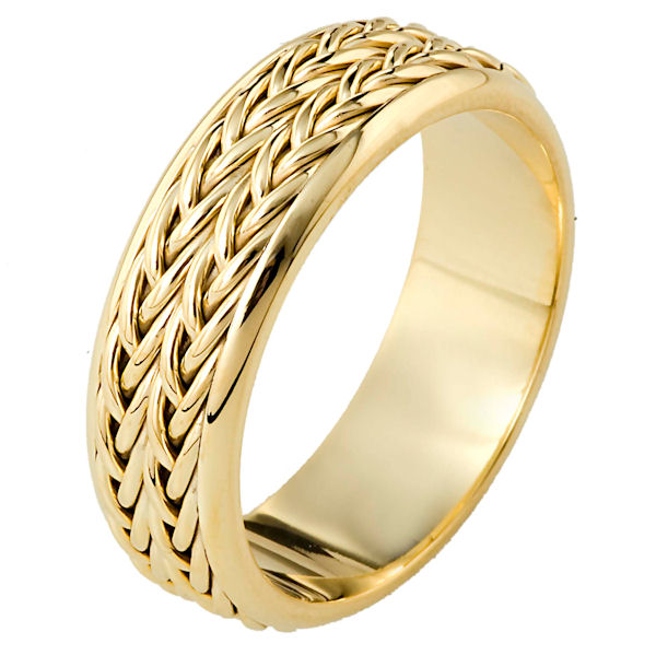 18 kt hand made comfort fit Wedding Band 6.0 mm wide. The ring has two beautiful hand crafted braids in the center with a polished finish. The rest of the band is polished. Different finishes may be selected or specified.