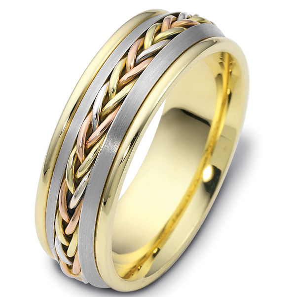 18 kt tri-color hand made comfort fit Wedding Band 7.0mm wide. The ring has a hand made braid in the center with a polished finish. The gold pieces on each side of the braid is a brush finish and the rest of the band is polished. Different finishes may be selected or specified.