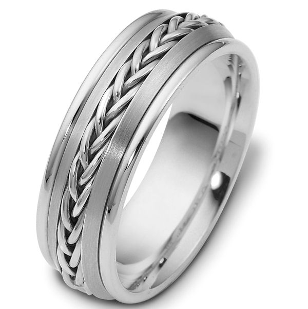 14 kt white gold, hand made comfort fit Wedding Band 7.0mm wide. The ring has a hand made braid in the center with a polished finish. The gold pieces on each side of the braid is a brush finish and the rest of the band is polished. Different finishes may be selected or specified.