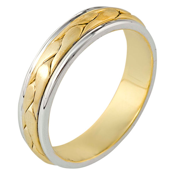14 kt two-tone hand made comfort fit Wedding Band 5.5 mm wide. There is a hand made braid in the center. It has a brush finish and the edges are polished. Different finishes may be selected or specified.