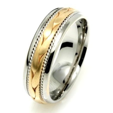 18 K, two-tone gold, hand made , 6.5 mm wide, comfort fit wedding band. The ring has a hand crafted braid in the center with one hand made rope on each side of the braid. The center of the ring is a matte finish and the rest is polished. Different finishes may be selected or specified.