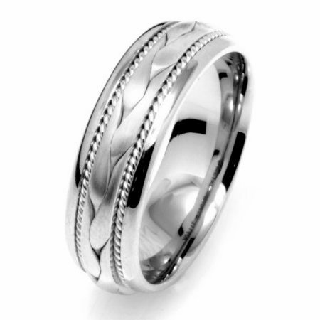Palladium, hand made comfort fit Wedding Band 6.5 mm wide. The ring has a hand crafted braid in the center with one hand made rope on each side of the braid. The center of the ring is a matte finish and the rest is polished. Different finishes may be selected or specified.