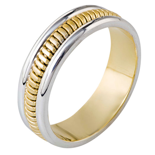 14 kt two-tone hand made comfort fit Wedding Band 6.0 mm wide. The ring has a hand made pattern in the center that is a brush finish. The edges are polished. Different finishes may be selected or specified.