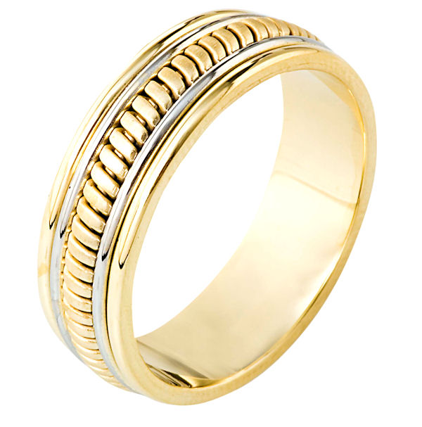 18 kt two-tone hand made comfort fit Wedding Band 6.5 mm wide. The ring has a hand made pattern in the center that is a brush finish. The edges are polished. Different finishes may be selected or specified.