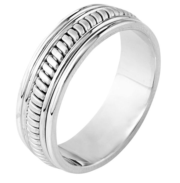 14 kt white gold, hand made comfort fit Wedding Band 6.5 mm wide. The ring has a hand made pattern in the center that is a brush finish. The edges are polished. Different finishes may be selected or specified.