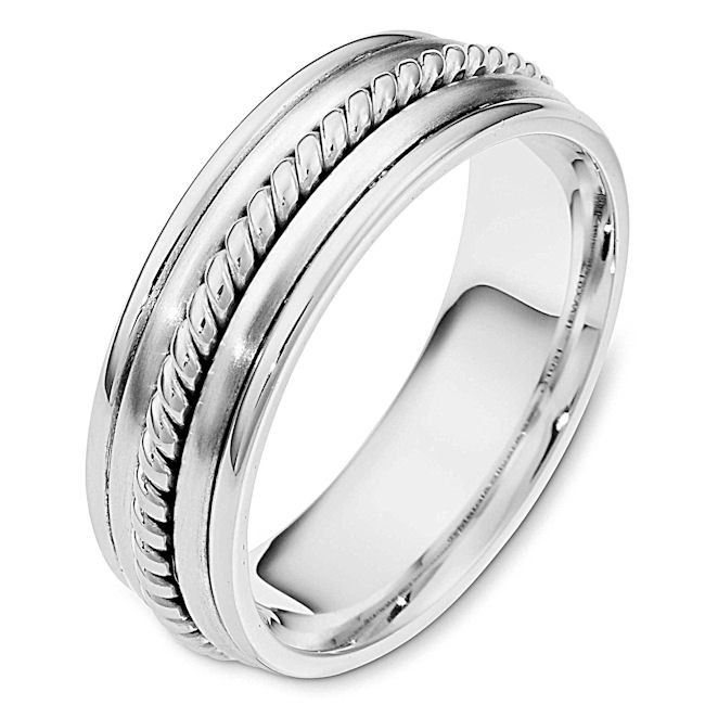 14kt white gold, hand made comfort fit, 7.0 mm wide,approximately 2.4 mm thick wedding band. The ring has a hand made rope in the center which is a polished finish. The two pieces on each side of the rope are matte finish and the rest of the ring is polished. Different finishes may be selected or specified.