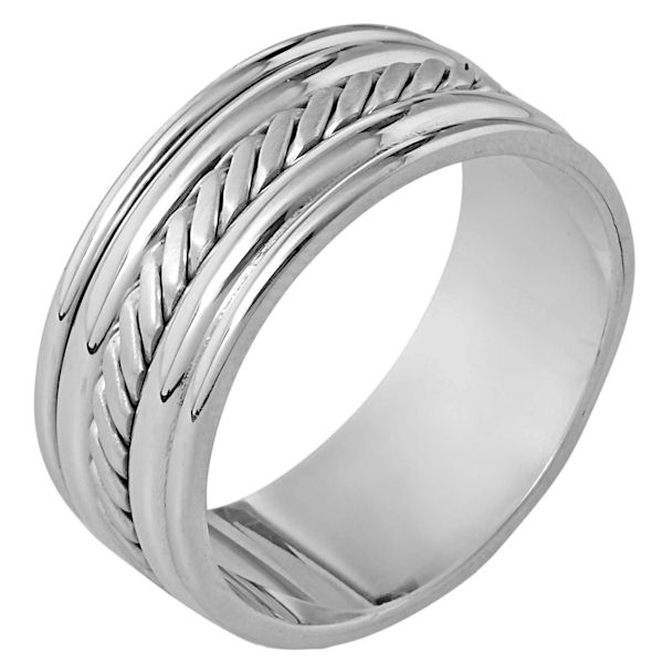 Platinum hand made comfort fit, 9.0 mm wide wedding band. The ring has a handmade pattern in the center which is a brush finish. The edges are polished. Different finishes may be selected or specified.