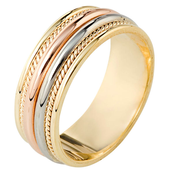 14 kt tri-color hand made comfortfit, 8.0 mm wide wedding band. The ring has two hand made ropes on each side of the band. The whole ring has a polished finish. Different finishes may be selected or specified.