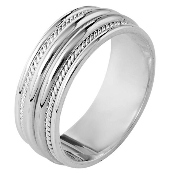 Platinum hand made comfort fit, 8.0 mm wide wedding band. The ring has two hand made ropes on each side of the band. The whole ring has a polished finish. Different finishes may be selected or specified.