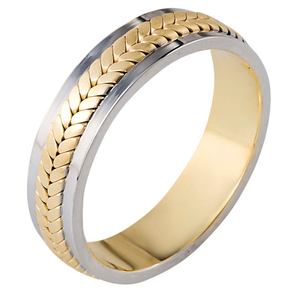 18 kt two-tone hand made comfort fit, 5.5 mm wide wedding band. The ring has a handmade braid in the center with a brush finish. The edges are polished. Different finishes may be selected or specified.