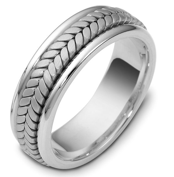 Palladium, hand made comfort fit, 7.0 mm wide wedding band. The ring has a handmade braid in the center with a brush finish. The edges are polished. Different finishes may be selected or specified.