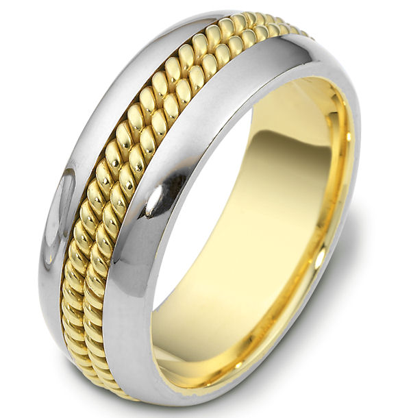 14 kt two-tone hand made comfort fit, 8.0 mm wide wedding band. The ring has two hand made ropes in the center. The whole ring is polished. Different finishes may be selected or specified.