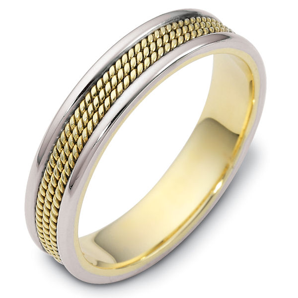 14 kt two-tone hand made 5.0 mm wide wedding band. The ring has 3 hand made ropes in the center with a polished finish. The edges are polished. Different finishes may be selected or specified.