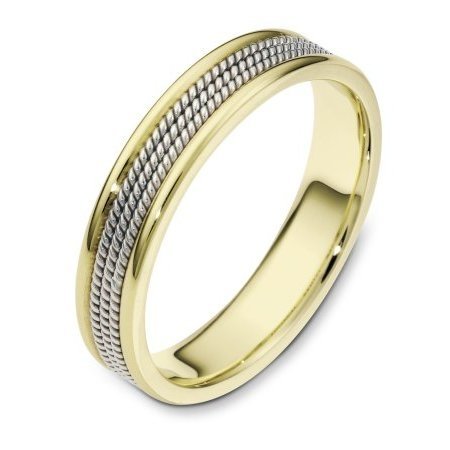 18 kt two-tone hand made comfort fit, 5.0 mm wide wedding band. The ring has 3 hand made ropes in the center with a polished finish. The edges are polished. Different finishes may be selected or specified.