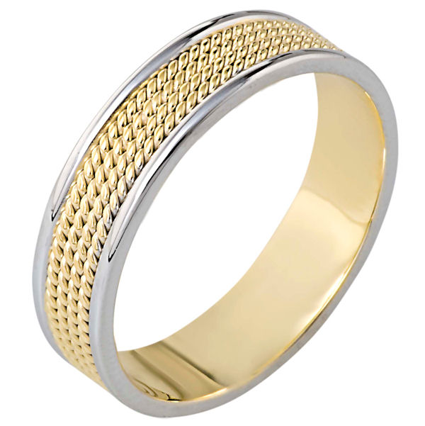 14 kt two-tone hand made comfort fit, 6.0 mm wide wedding band. The ring has 4 hand made ropes in the center with a polished finish. The edges are polished. Different finishes may be selected or specified.