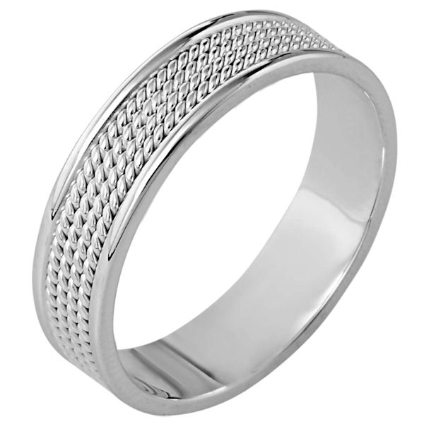 Platinum hand made comfort fit, 6.0 mm wide wedding band. The ring has 4 hand made ropes in the center with a polished finish. The edges are polished. Different finishes may be selected or specified.