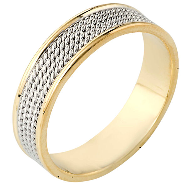18 kt two-tone hand made comfort fit, 6.0 mm wide wedding band. The ring has 4 hand made ropes in the center with a polished finish. The edges are polished. Different finishes may be selected or specified.