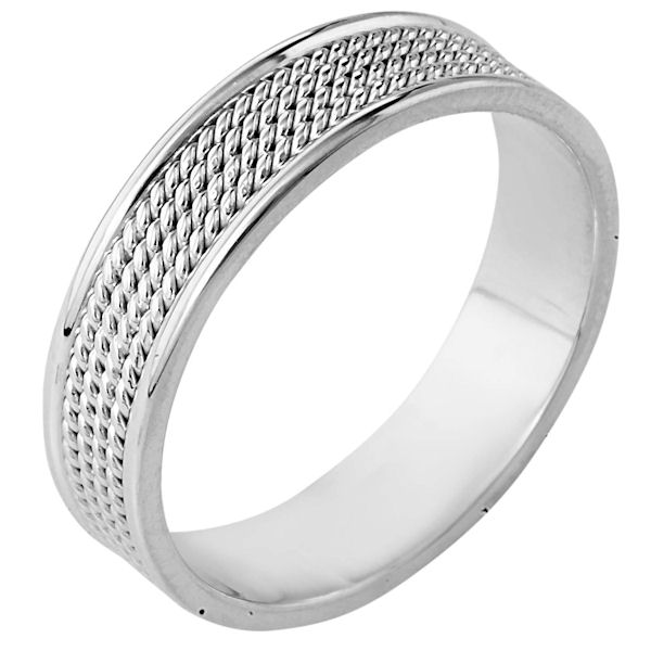 14 kt white gold, hand made comfort fit, 6.0 mm wide wedding band. The ring has 4 hand made ropes in the center with a polished finish. The edges are polished. Different finishes may be selected or specified.