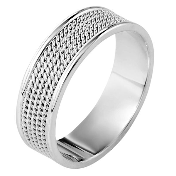 Platinum hand made comfort fit, 7.0 mm wide wedding band. The ring has 5 hand made ropes in the center with a polished finish. The edges are polished. Different finishes may be selected or specified.