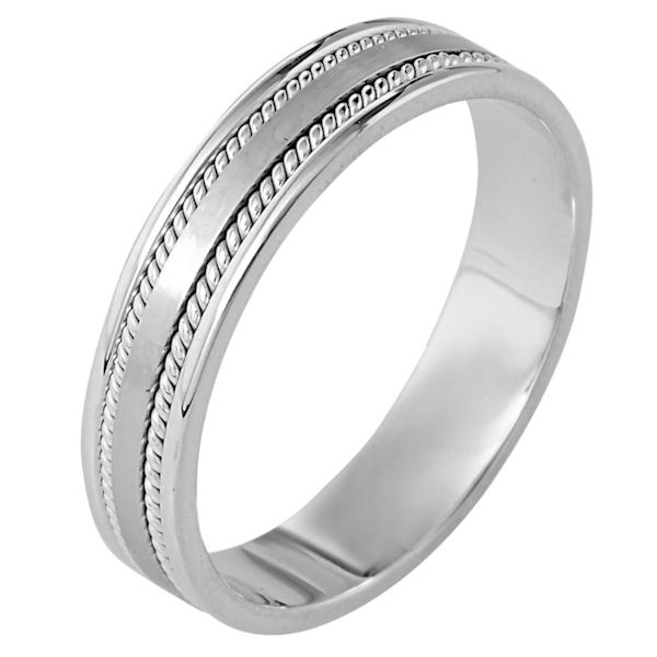 Palladium, hand made, comfort fit, 5.0 mm wide wedding band. The ring has two hand made ropes on each side of the band. The center portion of the ring is a matte finish and the rest of the band is polished. Different finishes may be selected or specified.