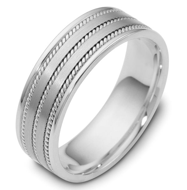 14 kt white gold, hand made comfort fit Wedding Band 7.0 mm wide. The ring has 3 handmade ropes inlayed in the ring. The two flat pieces in the center have a matte finish. The rest of the band has a polished finish. Different finishes may be selected or specified.