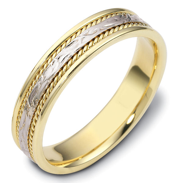 14 kt two-tone hand made comfort fit Wedding Band 5.0 mm wide. The ring has 2 handmade ropes on each side of the band. The center is patterned with a polished finish. Different finishes may be selected.