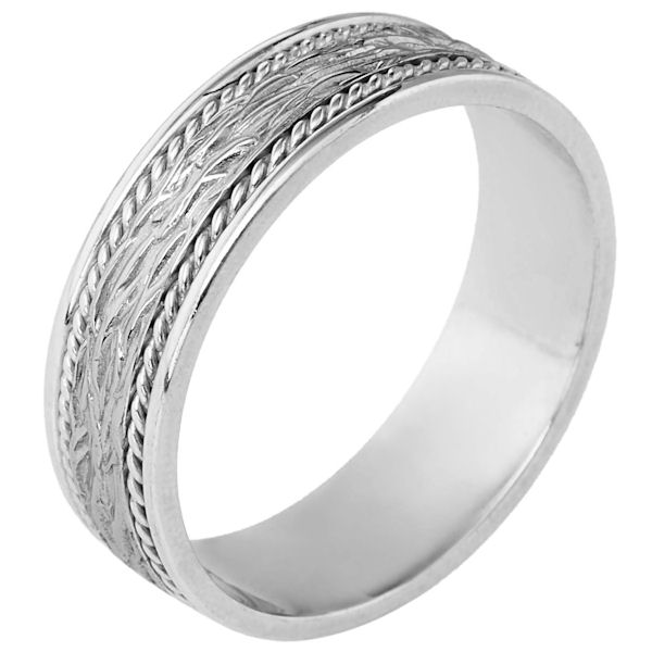 14 kt white gold, hand made comfort fit Wedding Band 7.0 mm wide. The ring has 2 handmade ropes on each side of the band. The center is patterned with a polished finish. Different finishes may be selected.