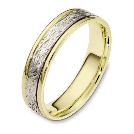 18 kt two-tone hand made comfort fit Wedding Band 5.0 mm wide. The ring has a beautiful pattern in the center with a polished finish. Different finishes may be selected or specified.