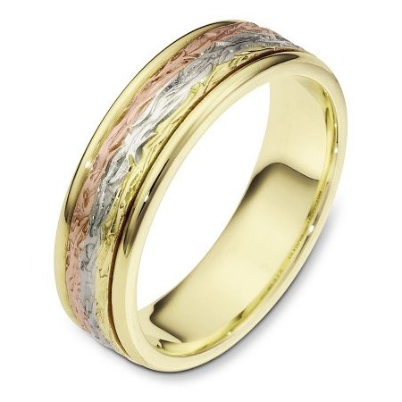 18 kt tri-tone hand made comfort fit Wedding Band 6.0 mm wide. The ring has a beautiful pattern in the center with a polished finish. Different finishes may be selected or specified.