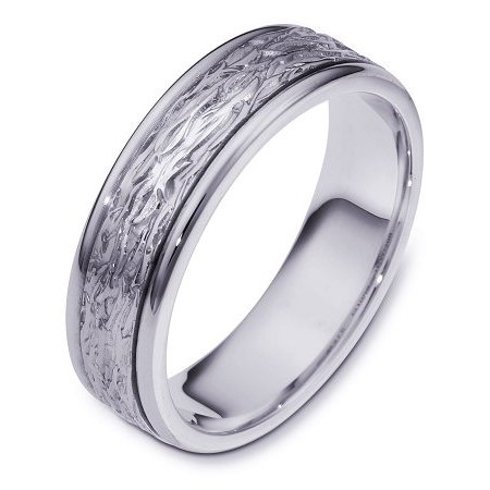 Platinum hand made comfort fit Wedding Band 6.0 mm wide. The ring has a beautiful pattern in the center with a polished finish. Different finishes may be selected or specified.