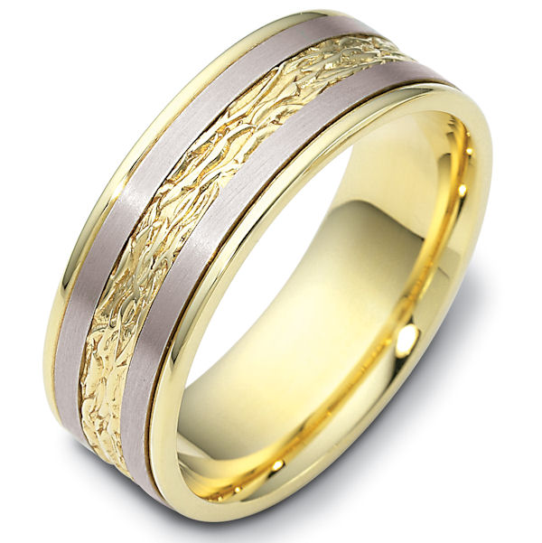 14 kt two-tone hand made comfort fit Wedding Band 7.0 mm wide. The ring has a beautiful pattern in the center. The two pieces on each side of the patterned gold are matte finish. The rest of the band is polished. Different finishes may be selected or specified.