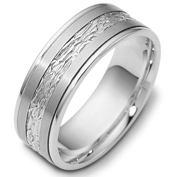 Platinum hand made comfort fit Wedding Band 7.0 mm wide. The ring has a beautiful pattern in the center. The two pieces on each side of the patterned gold are matte finish. The rest of the band is polished. Different finishes may be selected or specified.